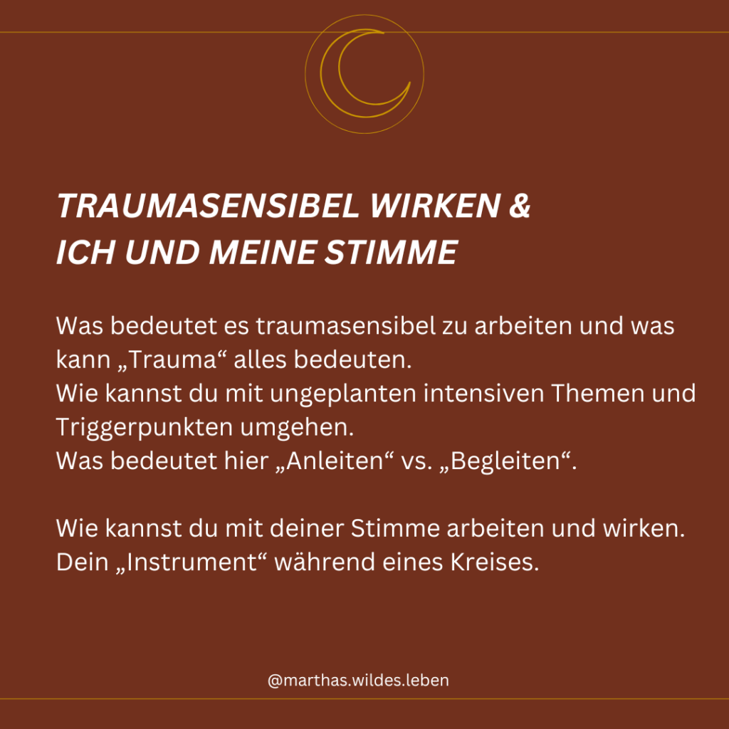 und lerne magische Räume zu kreieren und zu gestalten. Tauche in deine eigenen Fähigkeiten und Qualitäten als kraftvolle Frau*, Anleiterin und weise Hüterin. Ent-decke deine Stimme und deine verkörperte Präsenz als kraftvolle Tools für deine präsente und klare Anleitung dieser heiligen, emotionalen und verbindenden Räume.