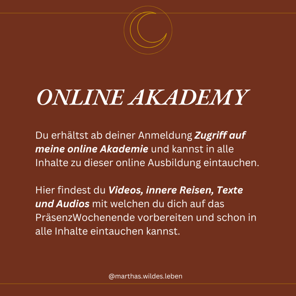 Du erhältst ab deiner Anmeldung Zugriff auf meine online Akademie und kannst in alle Inhalte zu dieser online Ausbildung eintauchen. Hier findest du Videos, innere Reisen, Texte und Audios mit welchen du dich auf das PräsenzWochenende vorbereiten und schon in alle Inhalte eintauchen kannst.